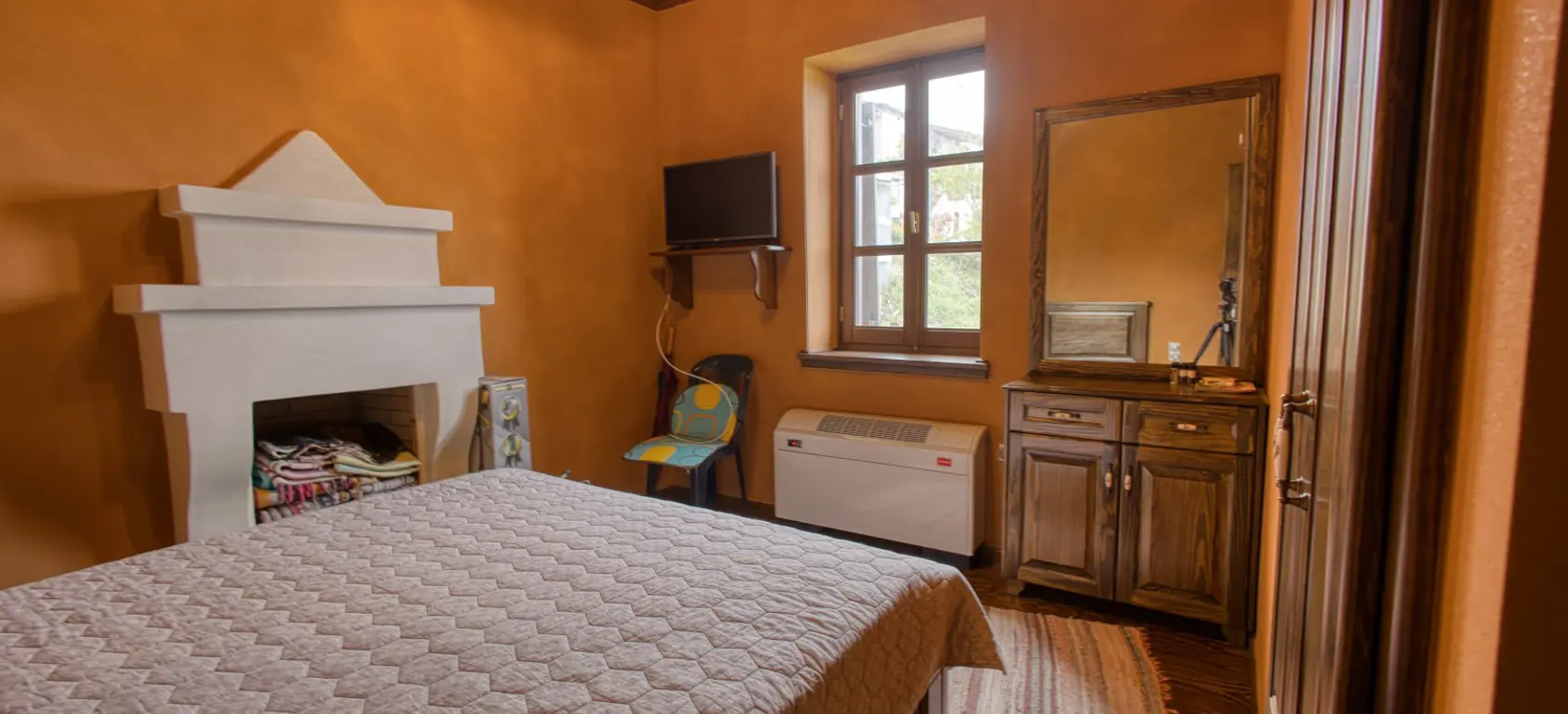 The independent guest house of 82 sqm has on the ground floor an open space consisting of the kitchen, the dining room, the bathroom and a utility room. On the upper floor of the guesthouse is the generously sized bedroom (41sqm) with its fireplace and balcony.