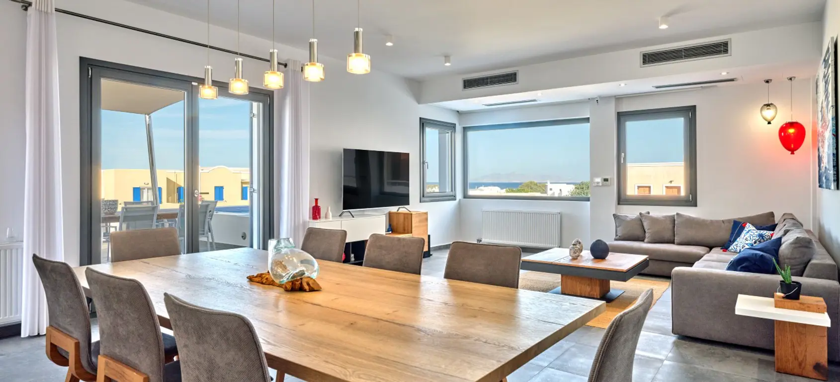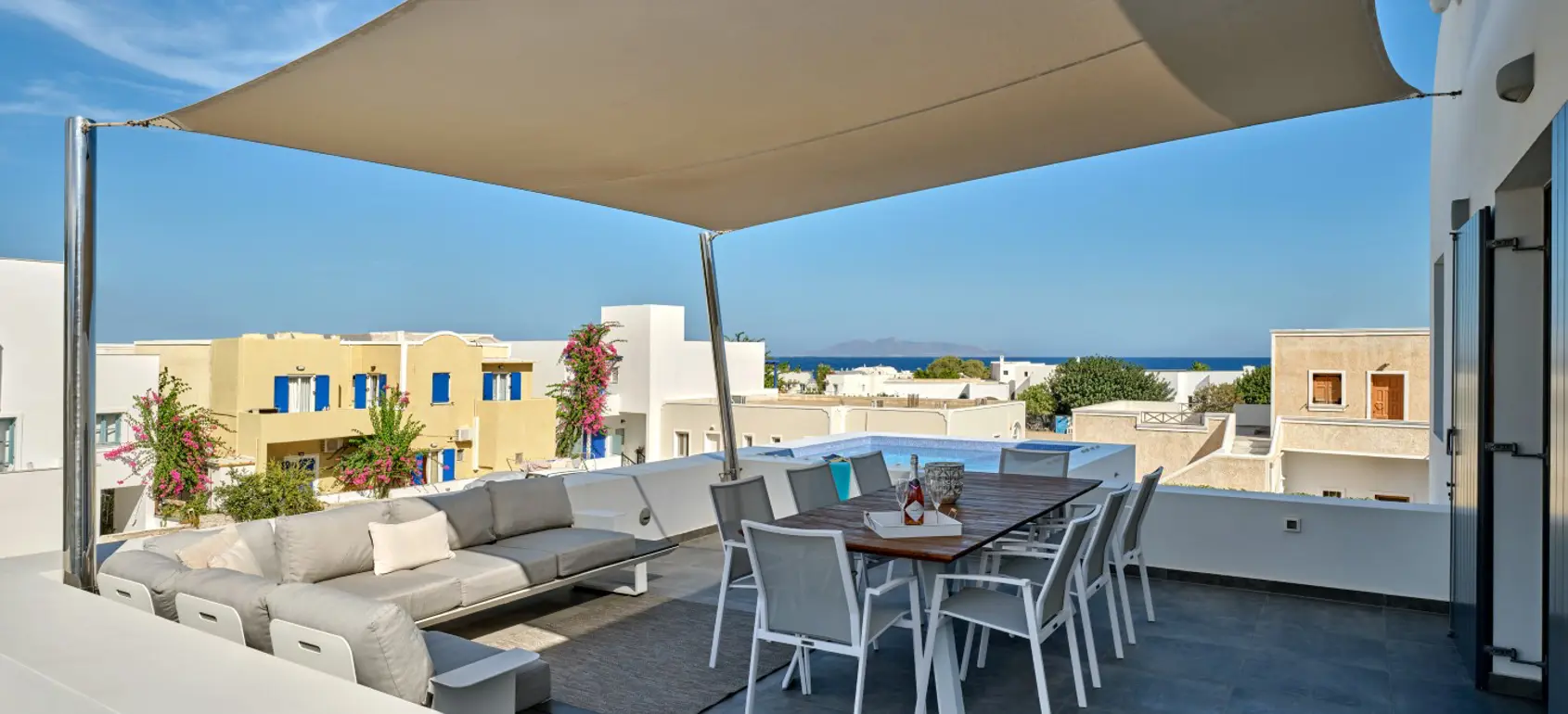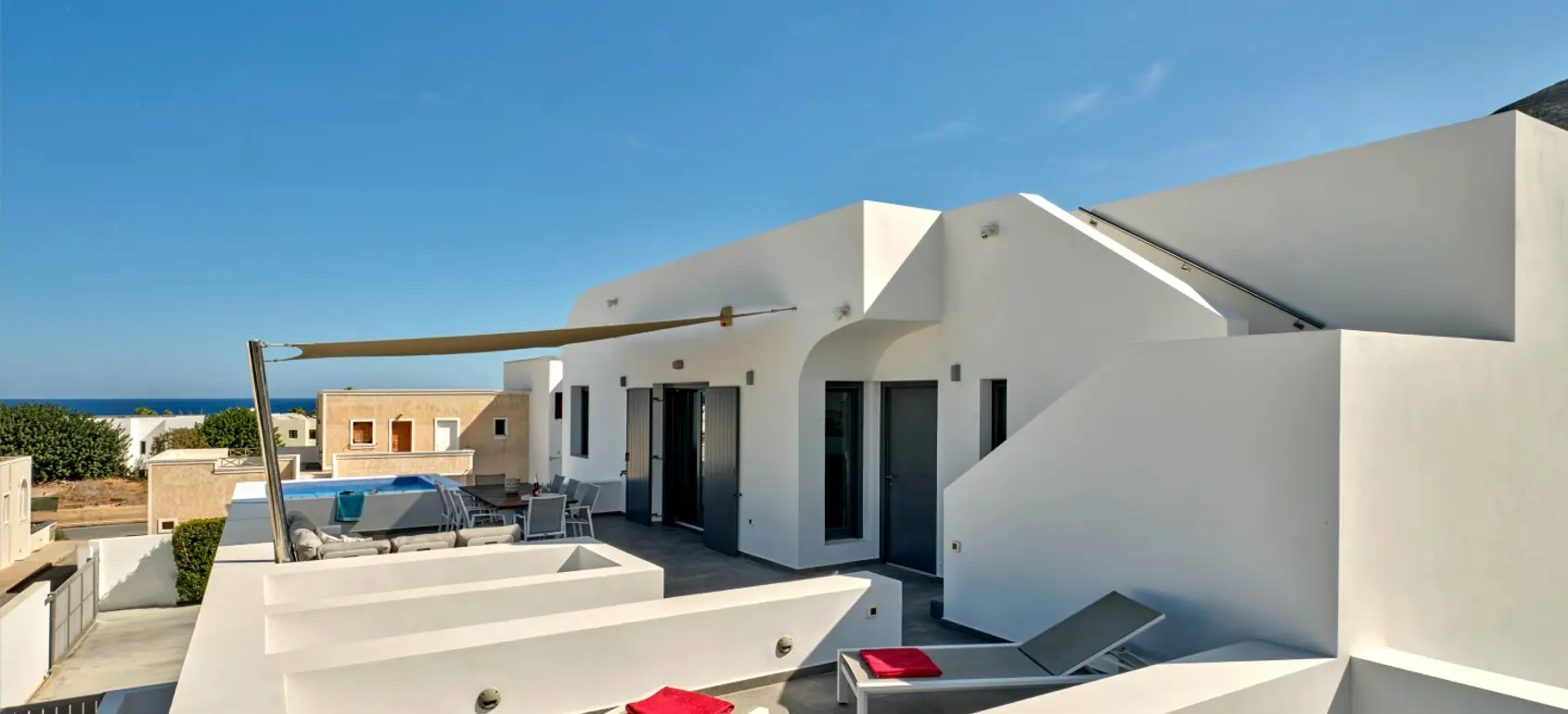 First Level consists of a single open area which has a large kitchen, dining area and living area. The living area opens to a large balcony which has sea views and looks to the island Anafi. The large balcony has a medium sized heated jacuzzi (about 3m X 3m).