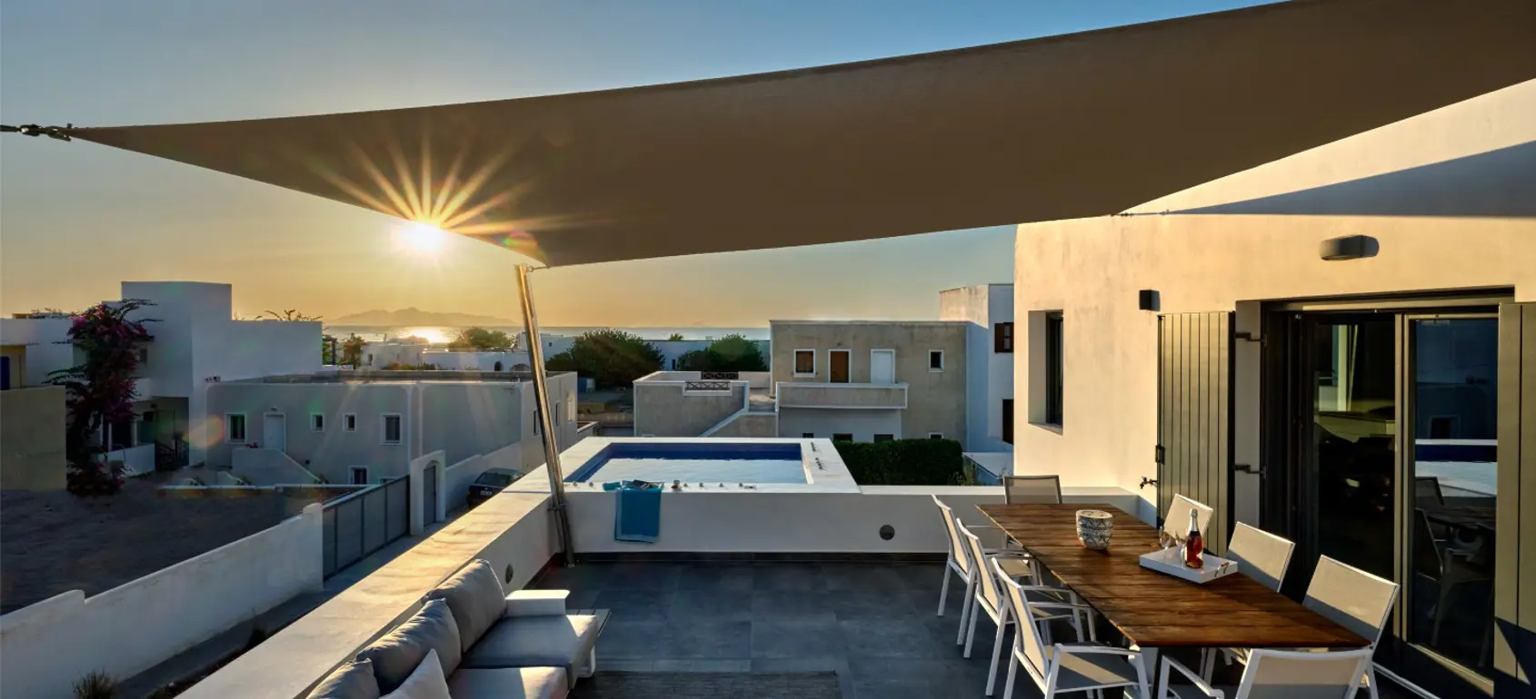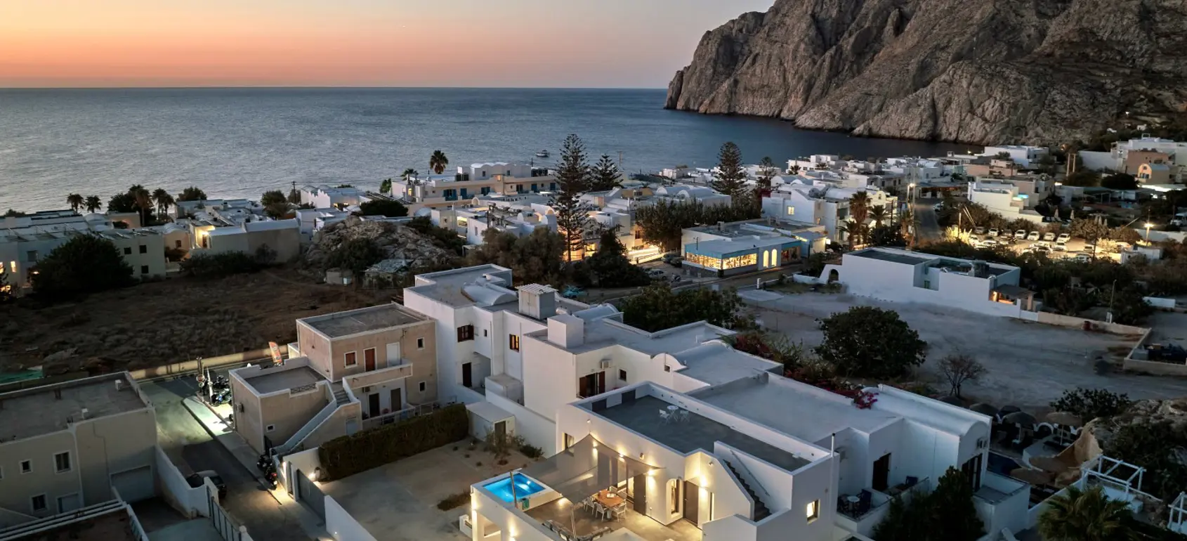 Panoramic views properties of the azure Aegean Sea and the world-famous Santorini sunset