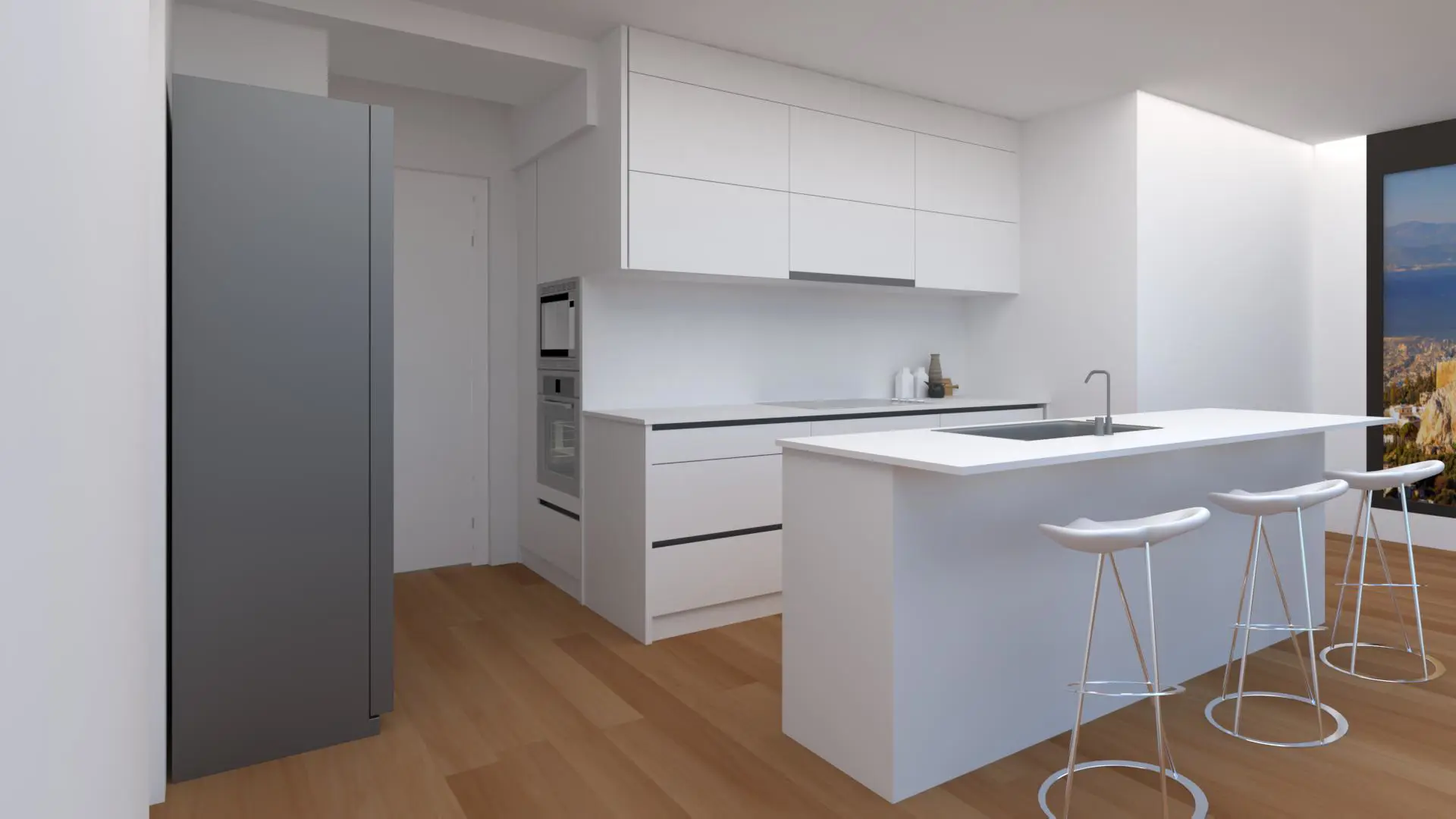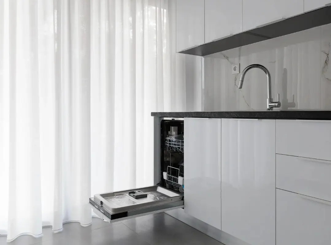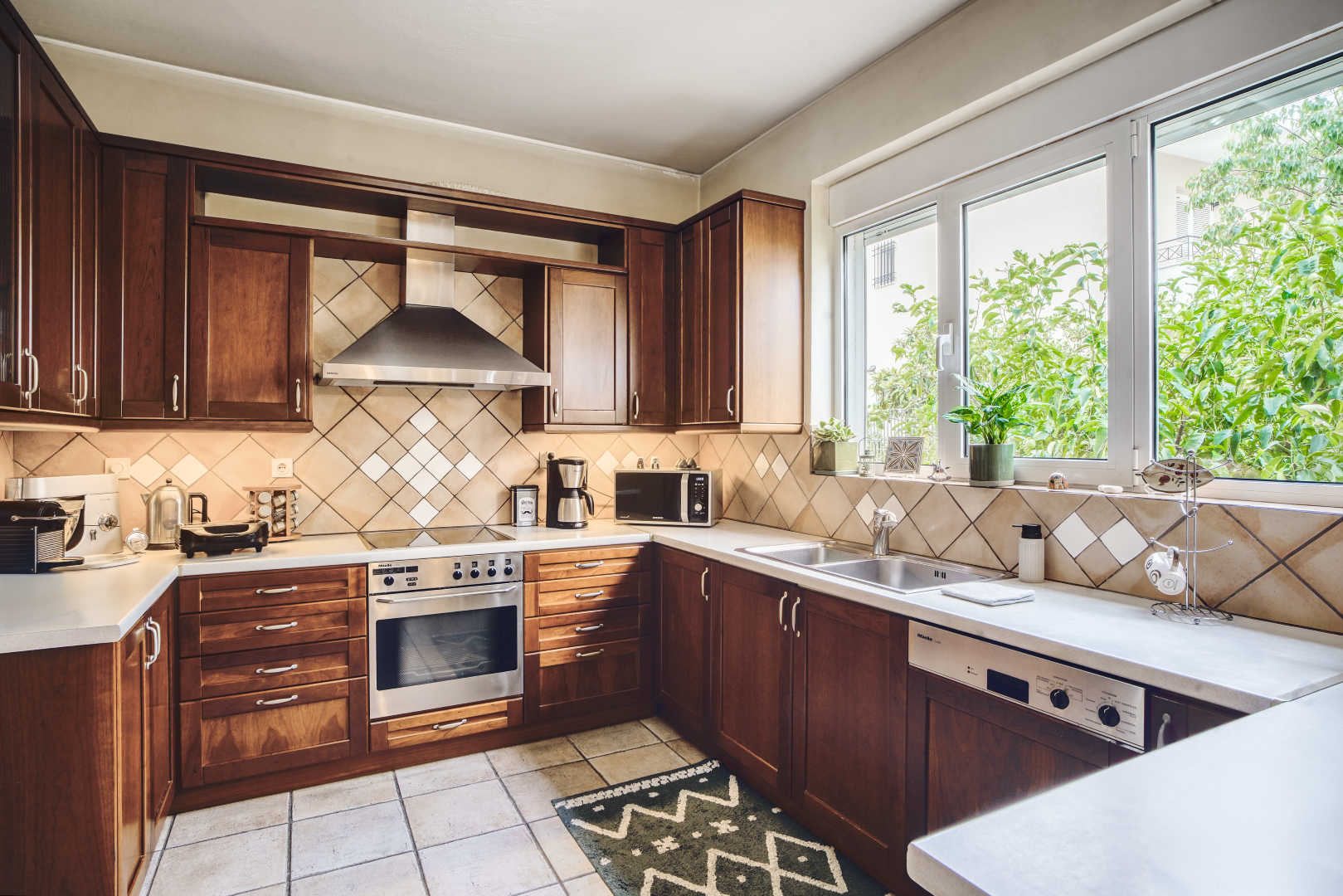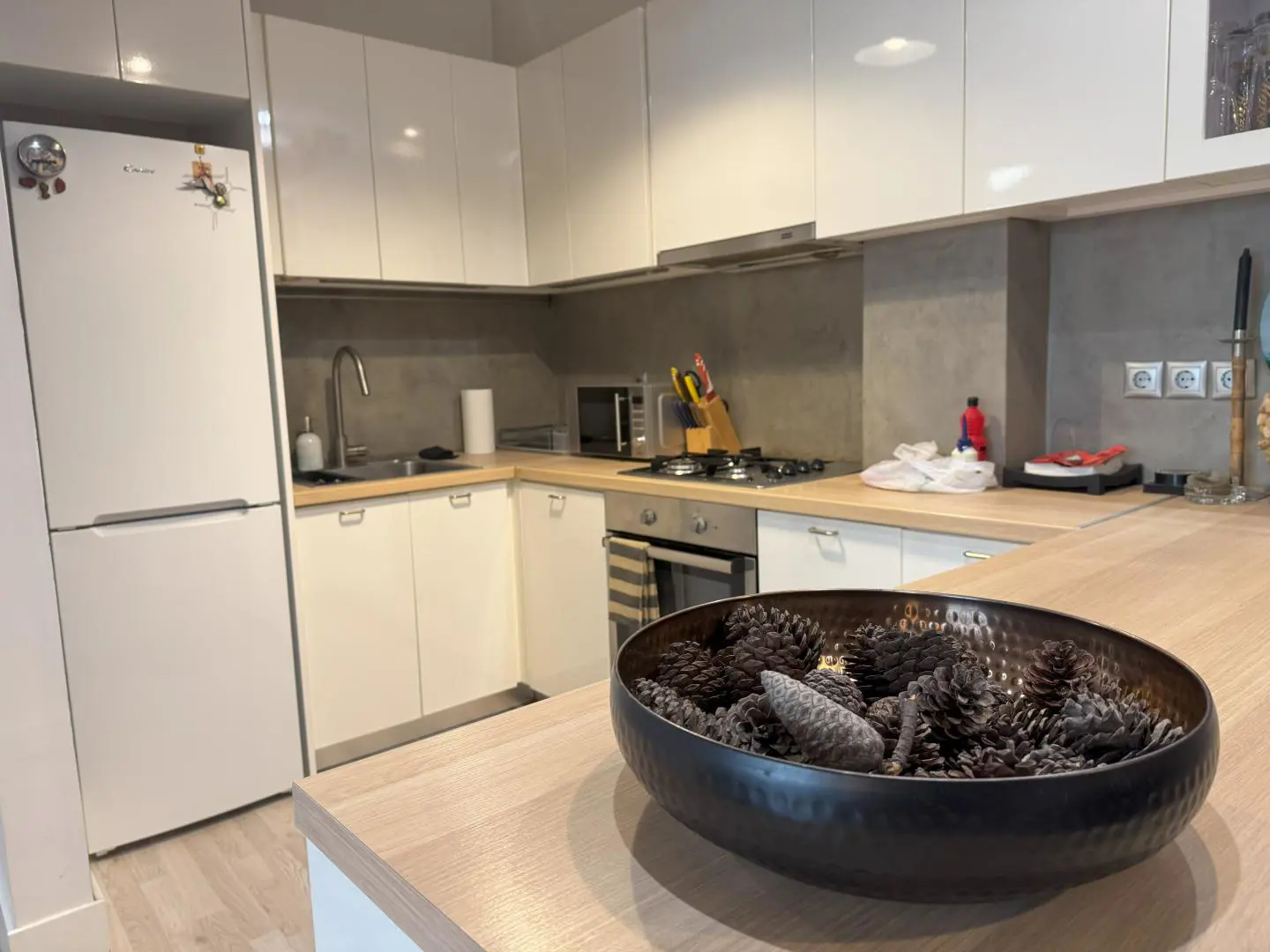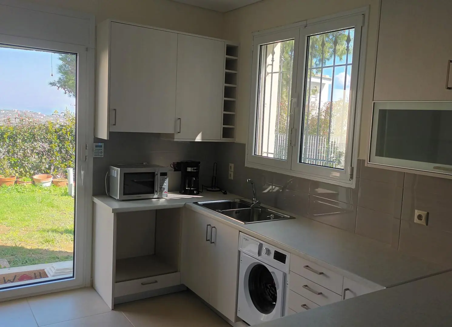 The sleek, modern kitchen comes fully equipped with everything you need for longer stays, including a washing machine, dishwasher, fridge, freezer, stove, microwave, and plenty of prep space.