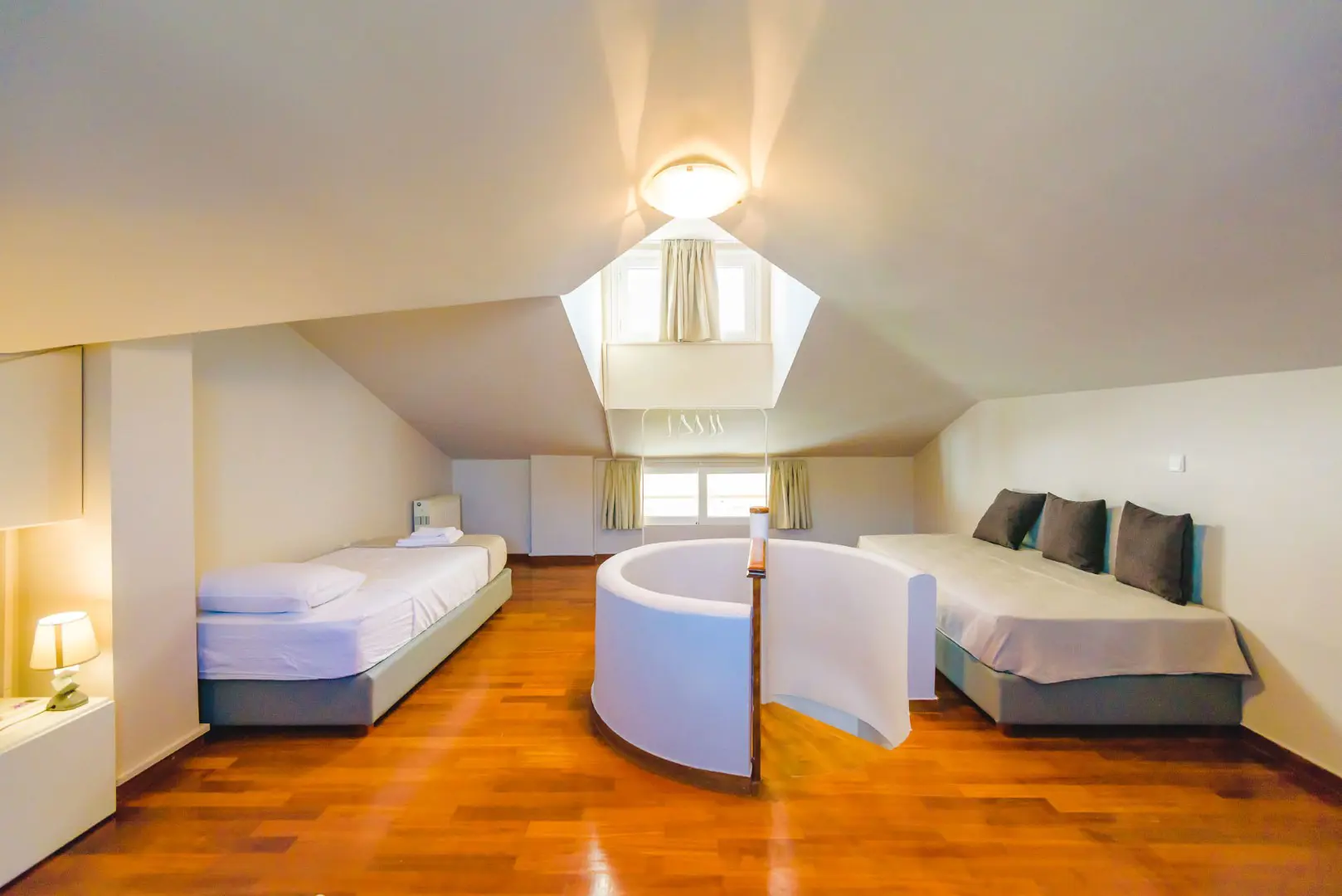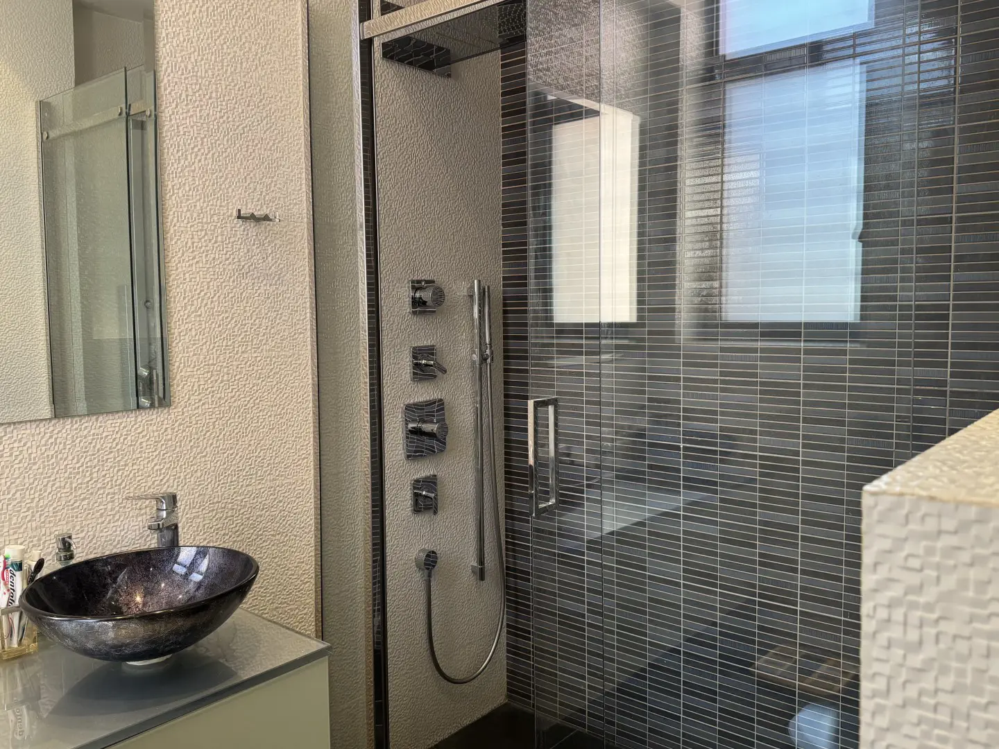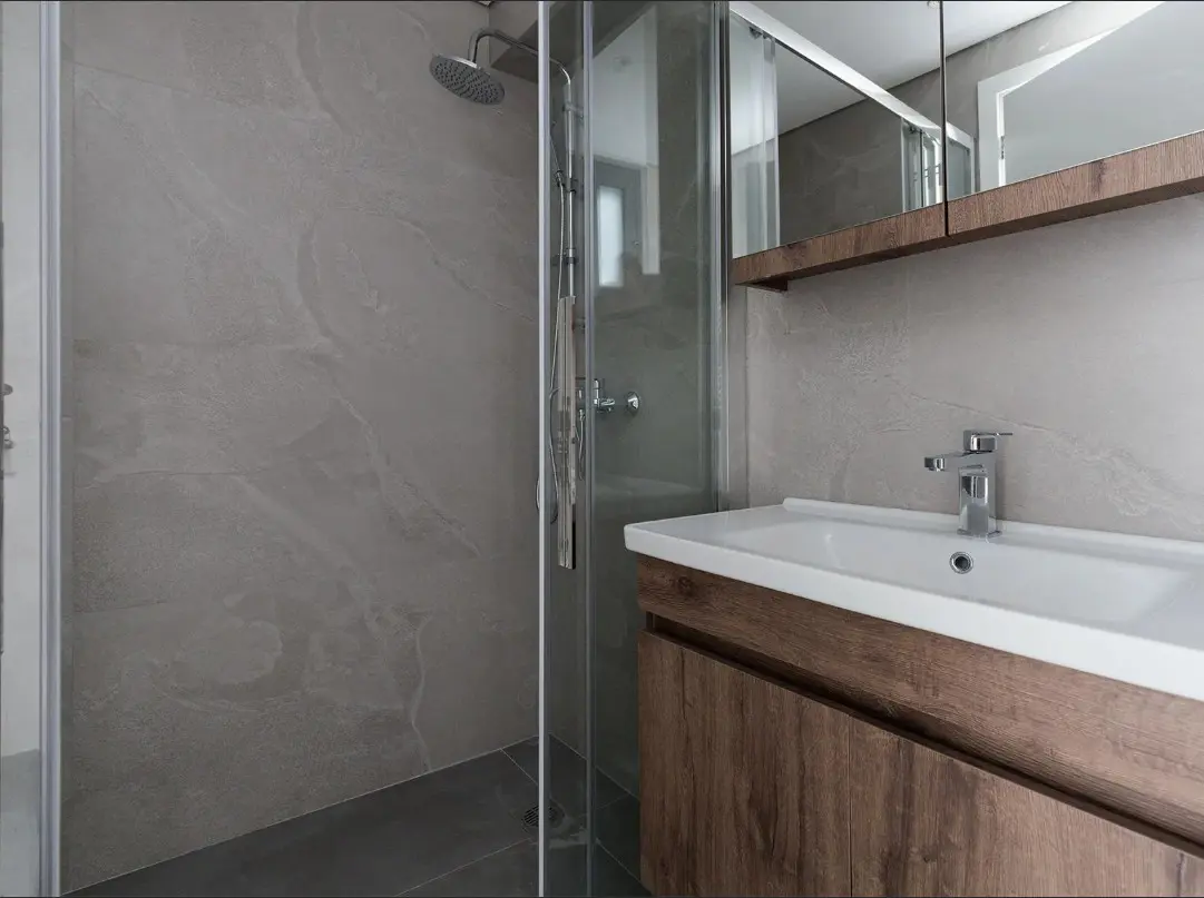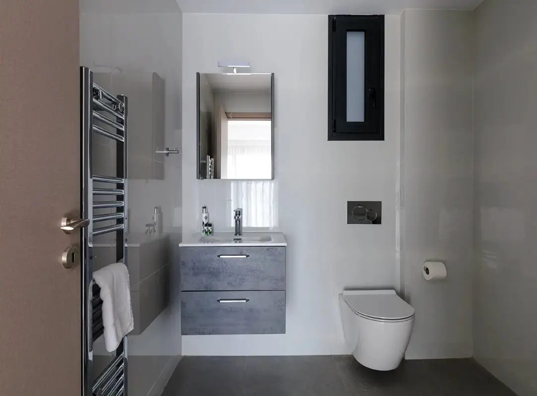 After a day exploring Athens' museums, galleries, and the nearby Acropolis, relax in the spacious bathroom featuring a walk-in shower with an overhead rain shower — a touch of luxury to elevate your daily routine.