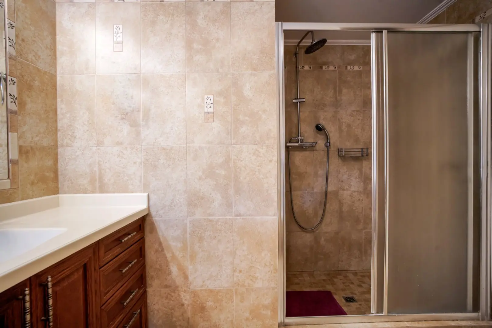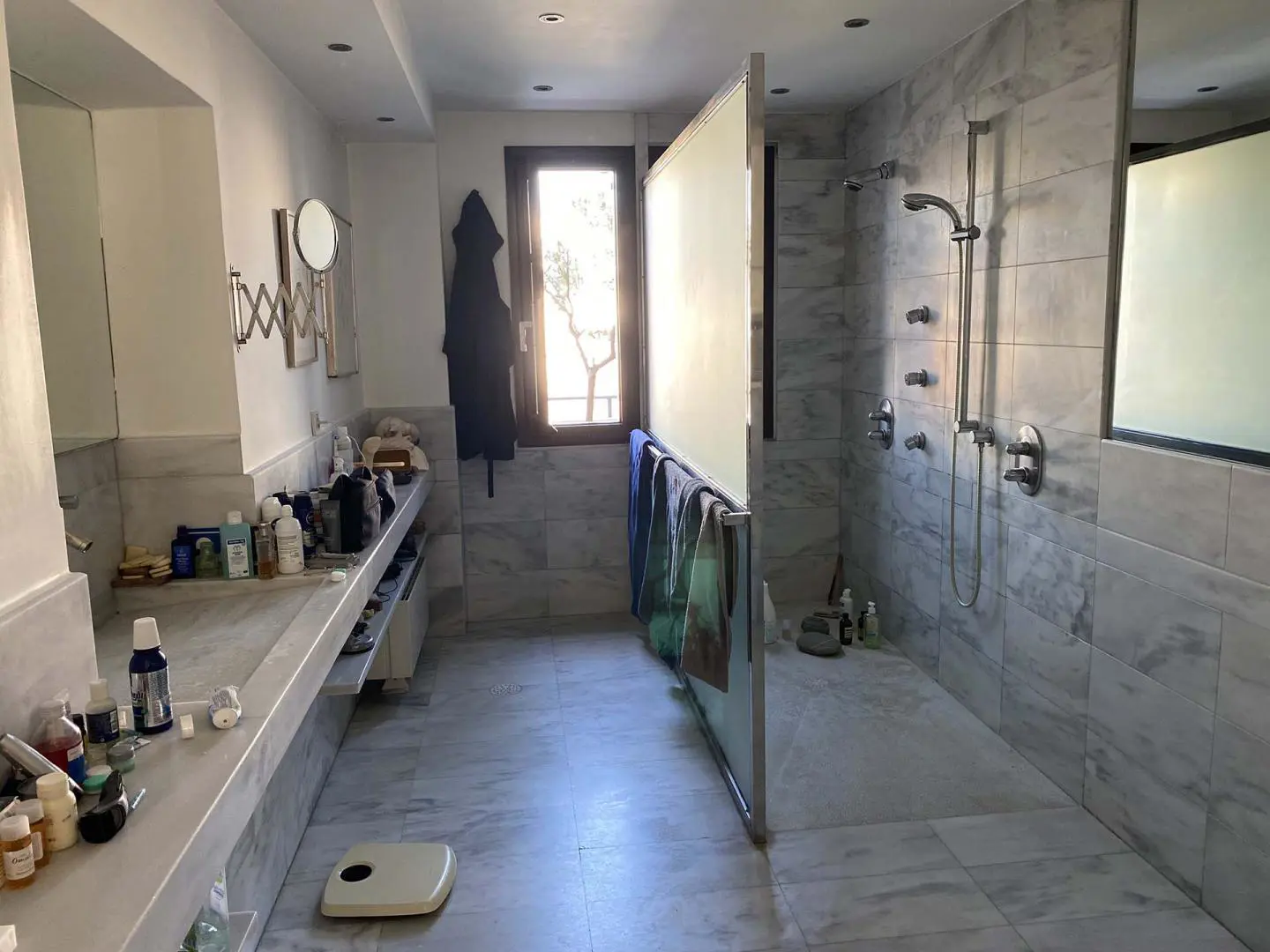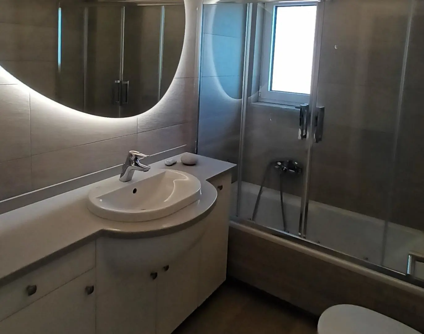 After a day exploring Athens' museums, galleries, and the nearby Acropolis, relax in the spacious bathroom featuring a walk-in shower with an overhead rain shower — a touch of luxury to elevate your daily routine.
