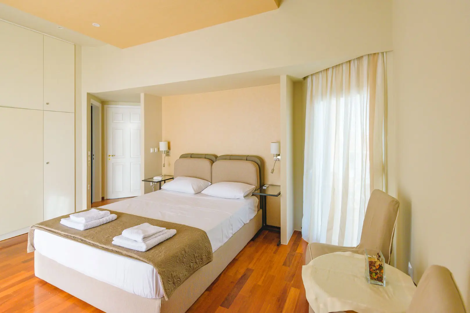 The bedroom invites you in with a plush queen-size bed, neoclassical design details, a make-up desk, ample drawer and closet space, and its own private patio for fresh air and quiet moments.