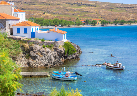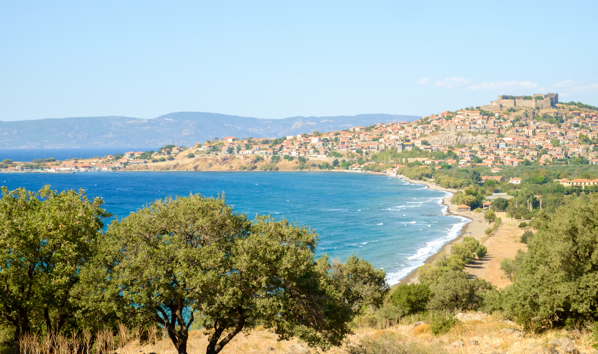 Lesvos is a Greek island located in the northeastern Aegean Sea. It has an area of 1,632 km2 (630 sq mi) with 320 kilometres (almost 200 miles) of coastline, making it the third largest Greek island. It is separated from Turkey by the narrow Mytilini Strait. Lesvos is a separate regional unit of the North Aegean region, and the only municipality of the regional unit. Its population is approximately 90,000, a third of which lives in its capital, Mytilene, in the southeastern part of the island. The remaining population is distributed in small towns and villages. The largest are Kalloni, the Gera Villages, Plomari, Agiassos, Eresos, and Molyvos (the ancient Mythymna). Mytilene was founded in the 11th century BC by the family Penthilidae, who arrived from Thessaly, and ruled the city-state until a popular revolt (590 – 580 BC) led by Pittacus of Mytilene ended their rule. In early Middle Ages, it was under Byzantine and Genovese rule. Lesvos was conquered by the Ottoman Empire in 1462, who ruled the island until the First Balkan War in 1912, when it became part of the Kingdom of Greece. The island is forested and mountainous with two large peaks, Mt. Lepetymnos at 968 m (3,176 ft) and Mt. Olympus at 967 m (3,173 ft), dominating its northern and central sections. The island’s volcanic origin is manifested in several hot springs and the two gulfs.