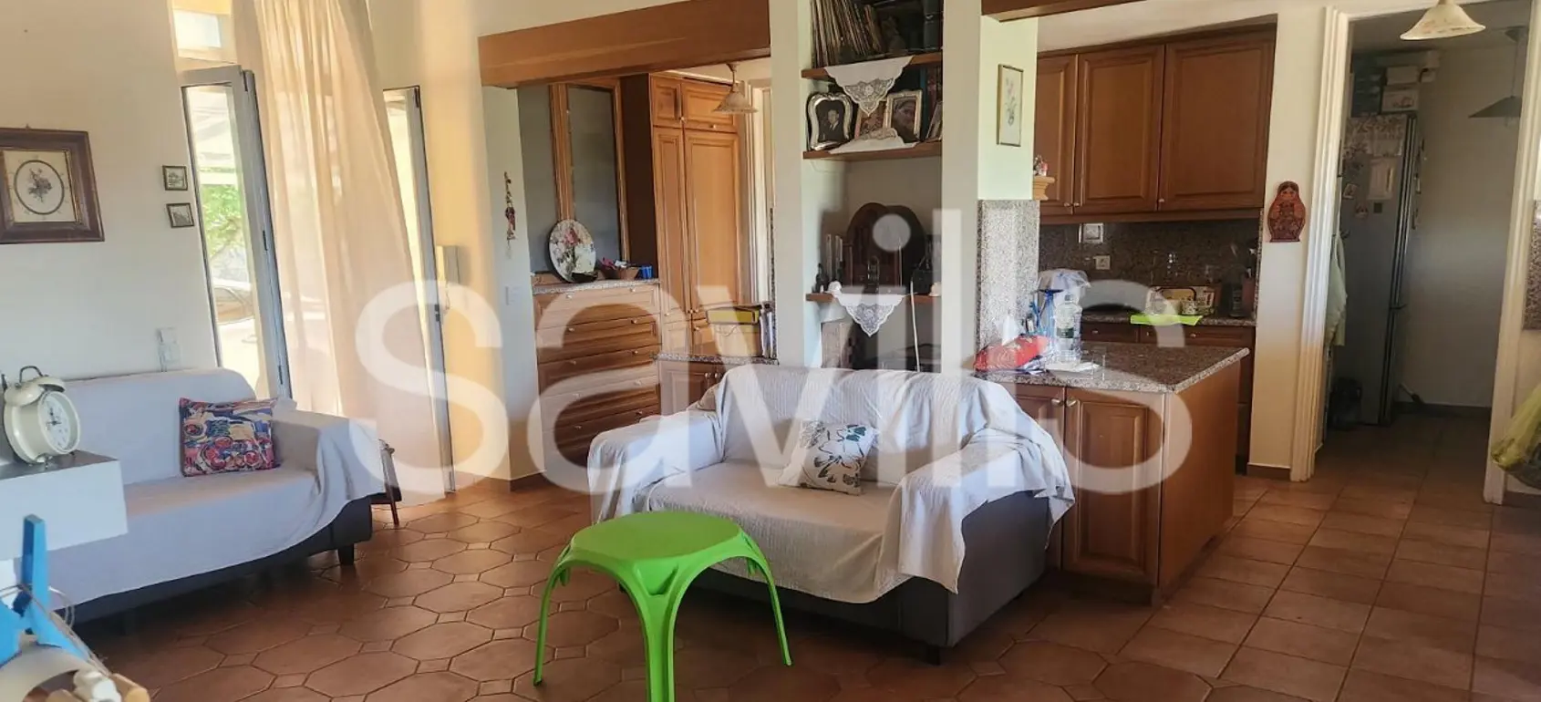 House arranged on two levels of 464 sqm in total on a plot of 1,360 sqm in the area of Aipeia. It is located only 6.7 km from the airport and 11 km from the city of Kalamata. The first level consists of a ground floor which includes a living room with fireplace and kitchen. On the same level we can find two bedrooms with their bathrooms and a cloakroom. The storerooms are located on the same level with a total area of 50 sqm. The communication of each floor is made by an internal staircase. On the same level there is another room of 30 sqm with independent entrance and autonomous heating, which has bedroom, living room, kitchen and bathroom and it is suitable for a guest room. The second level of the property is also the ground floor where the main entrance is located. It has a large kitchen with an island layout covered with granite marble. In the same space along with the living room and fireplace are the four spacious bedrooms, each of which has its own bathroom. Stepping out on the large terraces we can enjoy moments of relaxation as well as the beautiful view of the Messinian plain. The property has air conditioning, independent heating with oil, aluminum frames with screens and solar panel. The plot is fenced with built-in stone and has a swimming pool and covered BBQ. In one part of the plot a beautiful corner with a traditional wood oven has been created. The property is delivered fully equipped and in excellent condition. It is suitable for both holiday and permanent residence, as it is located close to Kalamata city and very close to taverns and roads.