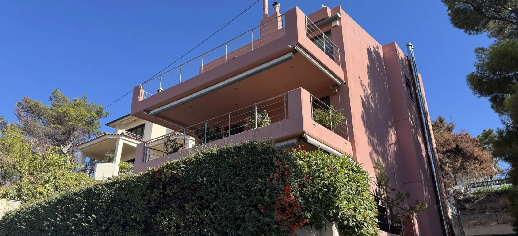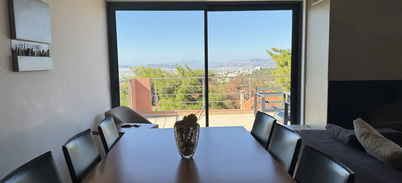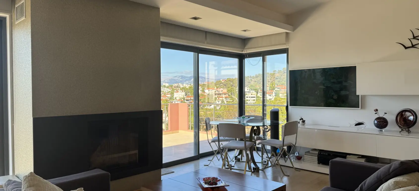 Maisonette with a total area of 250sqm in the best spot of Nea Penteli with unlimited panoramic view all over Athens. On the ground floor is located the entrance with the staircase and the elevator. On the first floor of 52sqm there is a bedroom, a bathroom, an area that is used as a living room and a kitchen from here there is access as on two terraces. This level can be independent or convert the kitchen area to a second bedroom. On the second floor of 100sqm is the master bedroom ensuite with a walk-in closet, a living room with fireplace, a dining room, open plan kitchen and a wc. The main terrace has excellent views, for sure much better is the view from the roof top that can be a beautiful roof garden. The auxiliary spaces, storage rooms, laundry and semi-basement garage have an area of 88sqm. All levels of the maisonette are connected by elevator.