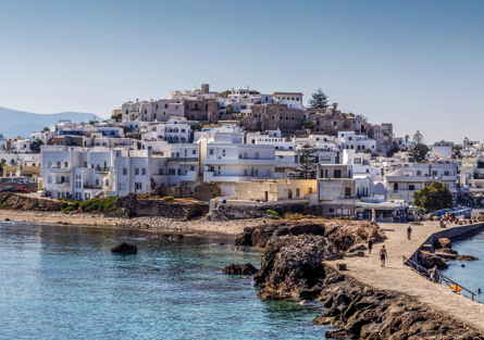 Naxos is the biggest and the greenest island in Cyclades with impressively high mountains, fertile valleys, lush green gorges, stunning seascapes and traditional villages perched high on mountain tops. Naxos is also an island of beautiful old churches, monasteries and Venetian castles coexisting harmoniously with Cycladic cubic houses. In the south of the island there are 22 km of sandy beaches with. The island of Naxos is located at 5 hours from the Port of Piraeus with the ferry, or at 3½ hours with a fast ferry, or 25 min from Athens Airport. You can visit many islands close by as Mykonos, Santorini, Syros, Paros etc in less than 1½ hour.